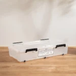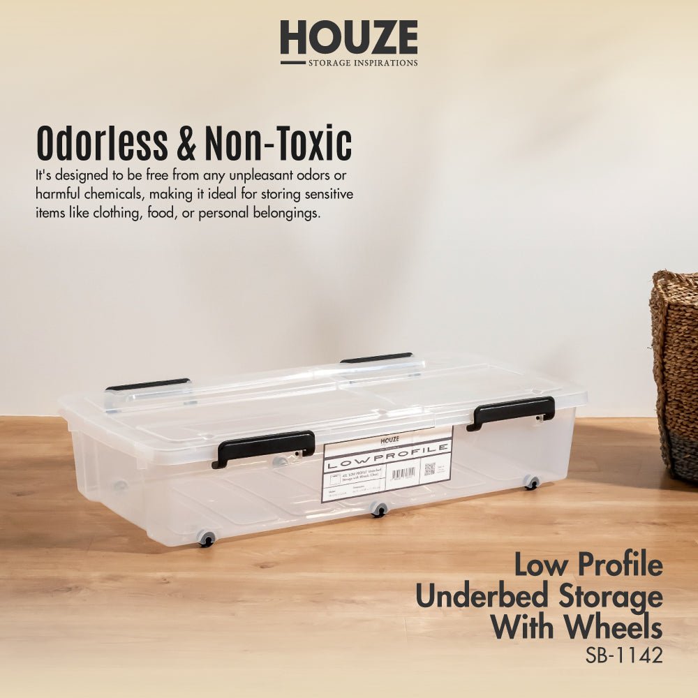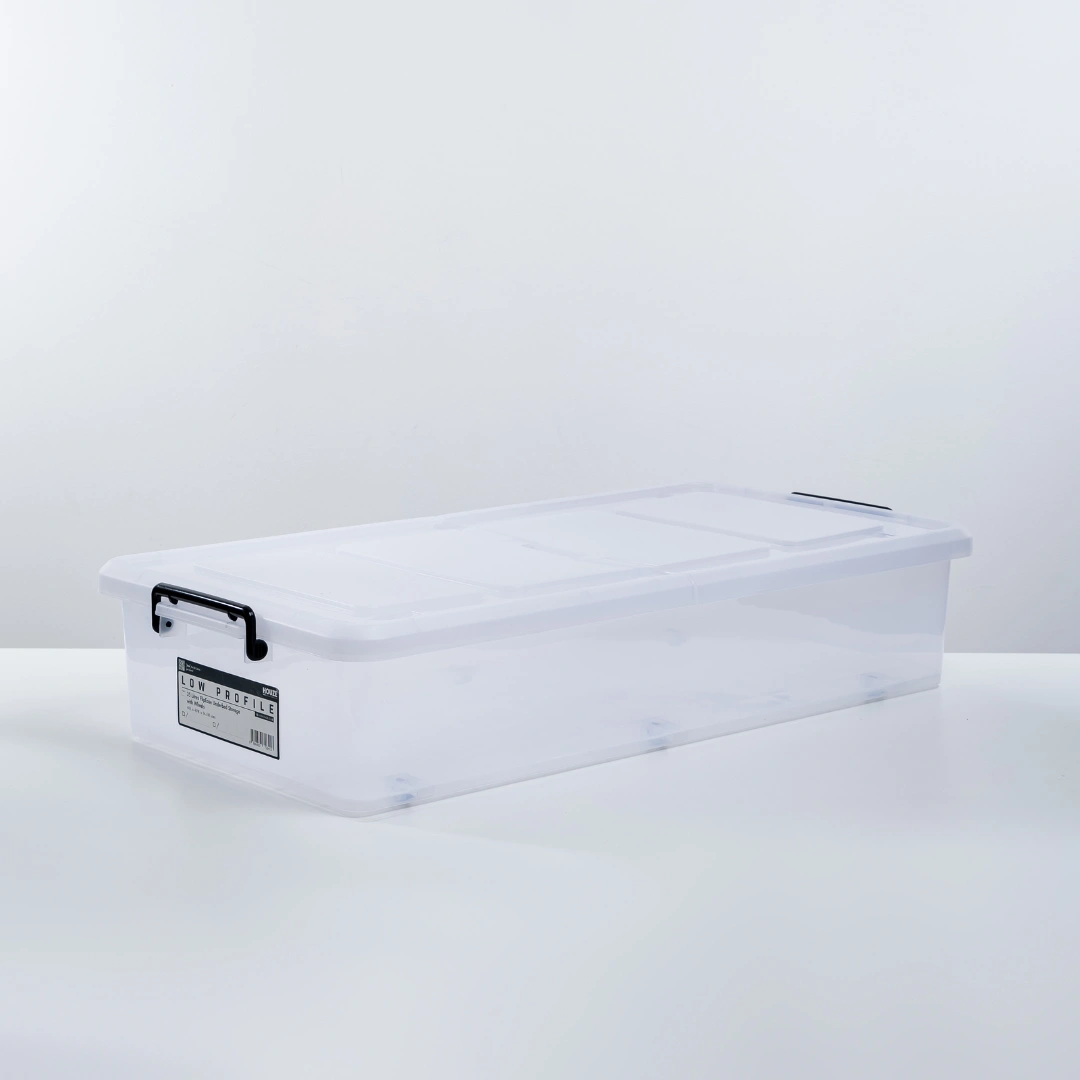 Now. spotlight the HOUZE – 35L/45L ‘LOW PROFILE’ FlipEase Underbed Storage with Wheels (Clear). Engineered to perfection. this piece is odourless. non-toxic and crafted from 100% virgin material. ensuring safety and durability. Its transparent body. complemented by sleek black handles and wheels. is not just a design choice but a reflection of its commitment to seamlessly blending into your home or office.