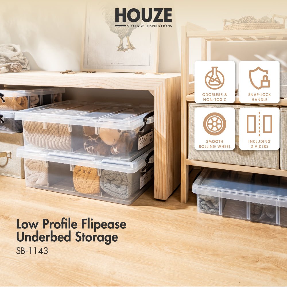 Introducing the HOUZE – 35L/45L ‘LOW PROFILE’ FlipEase Underbed Storage with Wheels (Clear). culminating in refined design thinking and aesthetic practicality. This range celebrates the essence of storage solutions without compromising style. seamlessly weaving functionality with modern charm.