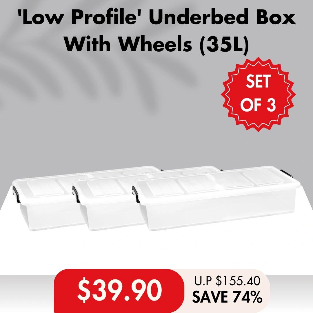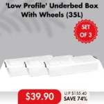• ‘Low Profile’ Underbed Storage Box With Wheels 35L (Clear): 86.5L x 43W x 17.5H cm